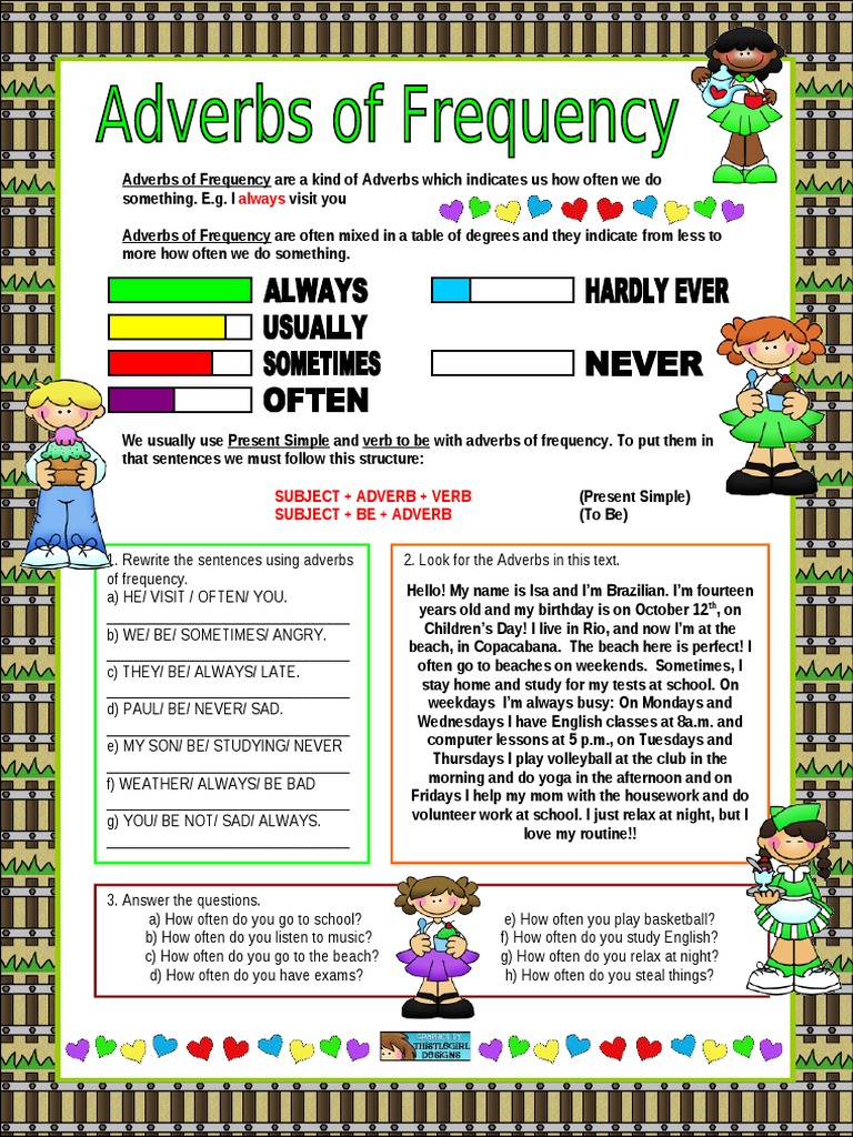 Adverb of frequency normally comes before adverb of time. The adverb answers the question 'how much in agreement was the opposition leader with the prime minister?' and hence entirely is an adverb of degree. • students will recognize adverbs of time and adverbs of frequency. However, frequency envelopes such as always, rarely, seldom, hardly ever and never are not brought to the beginning and the end of the sentence. Adverbs of frequency tell us how often we do things or how often things happen. Always, sometimes, never add to my workbooks (78) download file pdf add to google classroom add to microsoft teams Grammar worksheet all things grammar grammar focus adverbs of frequency level beginning to elementary (cefr a1) answer key 1. Many adverbs tell how a verb is done. We can use adverbs of frequency to talk about how often we do something. For example am, is, are, can, do, must, might, should etc. 2) if there is an auxiliary verb or modal, it falls between the auxiliary verb or modal and the verb. Learn all about adverbs of frequency in this fun animated video. Which kind of adverb is the word in capitals?